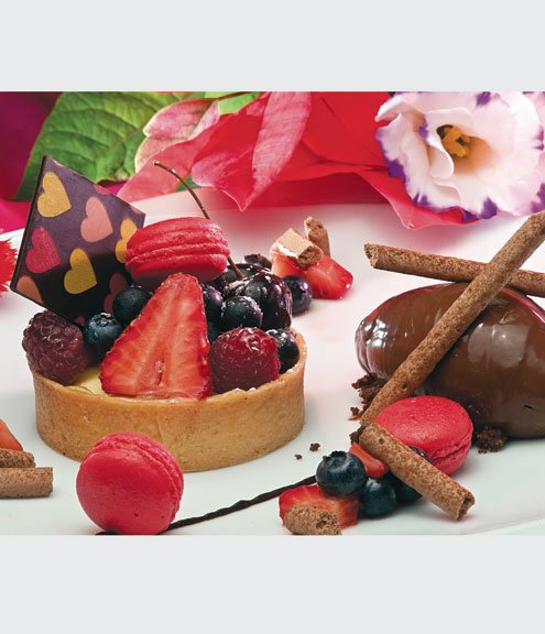 Ingredientes: Masa de tarta: 80 g de harina, 30 g de manteca, 30 g de azúcar impalpable, 1 huevo, sal, 8 g de polvo de hornear. Crema pastelera: 250 g de leche, 1 chaucha de vainilla, 2 yemas, 20 g de fécula de maíz, 70 g de azúcar. Sorbet de chocolate: 100 g de azúcar, 650 g de leche, 30 g de cacao, 80 cc de chocolate semiderretido, 30 g de estabilizante. Varios: Frutillas, frambuesas, arándanos, cerezas, merengue de cacao