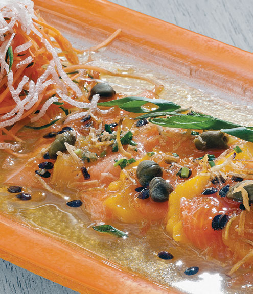 Preparacion: Reducir en una olla el jugo, el azúcar y las especias. Una vez que tenga la textura deseada sacar del fuego, retirar las especas, incorporar las alcaparras y dejar enfriar. Armar el plato intercalando las láminas de mango y salmón. Luego, rociar con la miel.