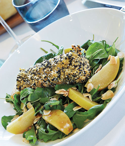 Ingredientes: Brie apanado: 100 g de queso Brie, 2 huevos, 100 g de pan rallado, 20 g de semillas de sésamo. Membrillos en almíbar: 500 g de membrillos, 200 g de azúcar, 600 cc de agua, 1 rama de canela, una pizca de sal. Aderezo de mostaza y miel: 200 cc de aceite de oliva, 100 g de mostaza de Dijon, 80 cc de aceto, 100 g de miel, 15 g de mostaza común y una pizca de sal.