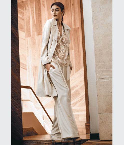 Top de gasa bordado ($2900, Mónica Socolovsky para Sathya), trench ($5190, Trosman) y pantalón ancho ($2190, Las Pepas).