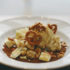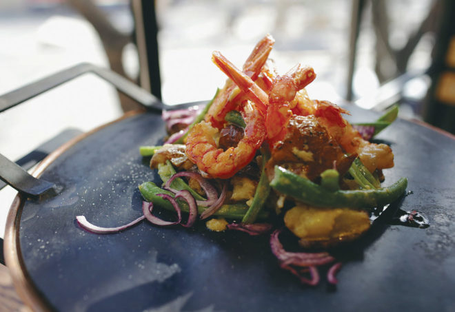 Langostinos en papines aplastados con vinagreta de mostaza y miel