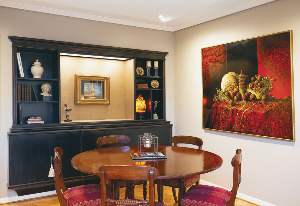 Antes y después. En el comedor, a lado de la pintura de Mazza se dispone el mueble que ya estaba empotrado y que era de madera raiz con puertas. “Muy pesado y triste -agrega la diseñadora- por lo que le sacamos las puertas, lo lustramos en negro, gastamos los cantos; el centro se forró con rafia dorada y le agregamos una marina de Koek Koek de la pareja.”