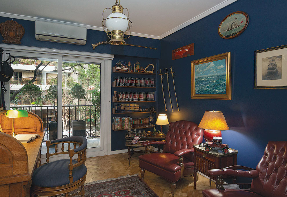 Bien náutico. El propietario es navegante y fanático de la navegación por lo que se creó su escritorio como si fuera un camarote con paredes en azul naval. La dueña de casa aportó la idea de poner una lámpara marinera que ese mismo día su marido consiguió y llevó al departamento.