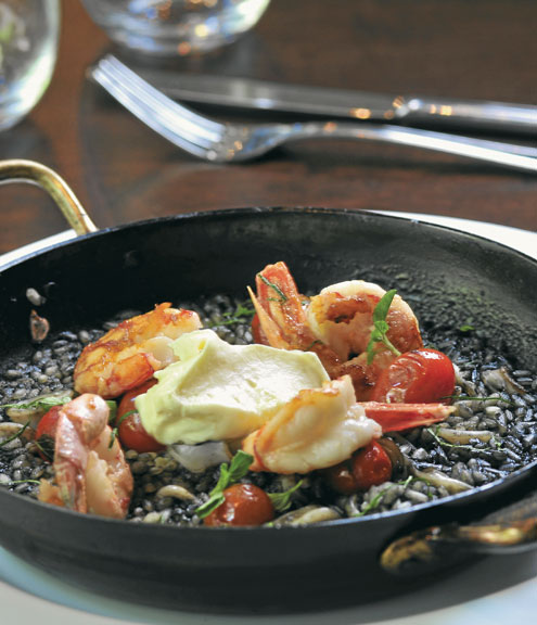 y tinta. Colocar el arroz en una fuente y mojar con caldo, llevar a horno caliente hasta que quede crocante. Retirar y agregar oliva, ralladura y Mascarpone.