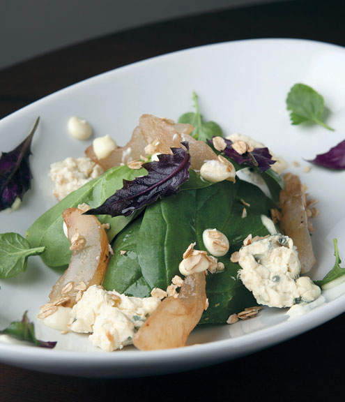 Ensalada de espinacas, queso azul y peras