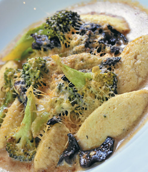 Escurrir la ricota, colocar en un bowl y batir para eliminar grumos. Agregar los huevos y los demás ingredientes, rectificar sazón. Armar quenelles pequeñas con cuchara y reservar en placa con semolín. Cocinar en agua hirviendo hasta que suban. En otra fuente calentar la manteca y el aceite, colocar la salvia y el ajo, saltear los broccoli hasta dorar, salpimentar, agregar los hongos, la crema y el jugo de limón. Agregar los gnocchi