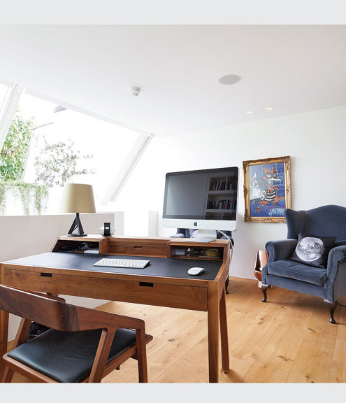 Mesa-escritorio y silla modelo “salb” de Tom Dixon. Sillón en pana by Jimmie Martin. Obra de arte con marco francés. Ventanas con paneles corredizos para ganar espacio. Pasado y presente en cada uno de los muebles elegidos para este lugar de trabajo.