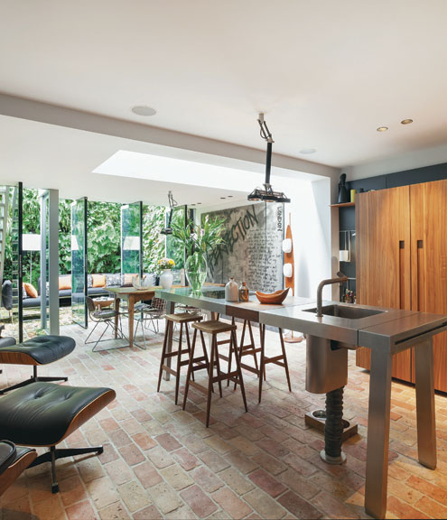 Purismo absoluto en el diseño de los muebles de cocina, Bulthaup modelo b2, convive con el mobiliario Eames, para el relax y con un increíble piso rústico de ladrillo. Seguidilla de paneles giratorios de cristal, invitan a disfrutar del jardín vertical y el estar exterior.