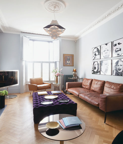 Tiene una diposición tradicional del mobiliario con acabados ingeniosos y complementos decorativos de creadores británicos como Jimmie Martin, Tom Dixon y Abigail Ahern. Conviven armónicamente con los muebles clásicos y con los de los 50´ y 60´. Un gran butacón con capitoné aporta color al espacio.