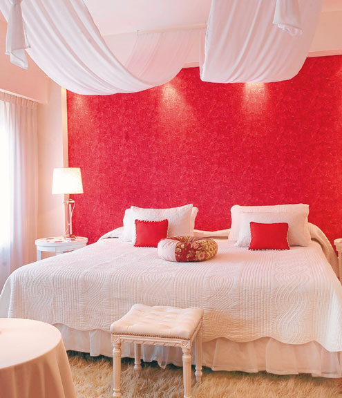 Para lograr esta suite se unieron dos habitaciones, a eso se debe la gran dimensión del dormitorio principal. La pared del fondo se cubrió con un papel afelpado de rosas rojas.