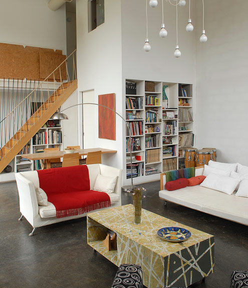 Los sillones son creación del dueño de casa. Encima, almohadoncitos tipo caramelo continúan con la paleta en un género símil arpillera. La escalera tiene una baranda muy particular, realizada por Rodrigo Mirto, un escultor que trabaja hierro