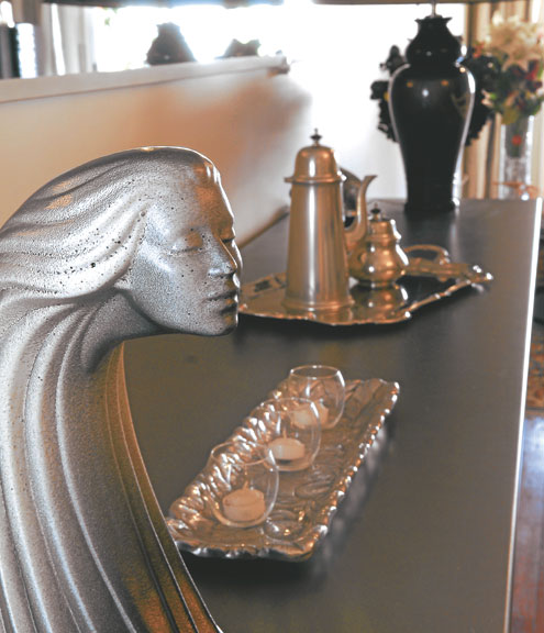 Al costado un vajillero bajo tambien en tono metálico. Estos valores de colores contrarrestan la calidez de la suite. A lo largo del lugar un espejo refracta luz y agranda las dimensiones del ambiente. La escultura de mujer fue traída de una viaje por la dueña de casa.