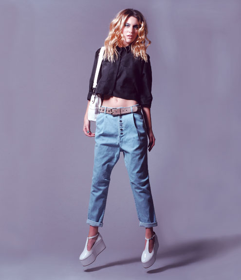 Camisa con detalles de gamuza ($395, Blackmamba), pantalón de jean con botones ($620, Chocolate), cartera con recortes ($385, XL Extra Large) y zapatos con plataforma ($1249, Paruolo).