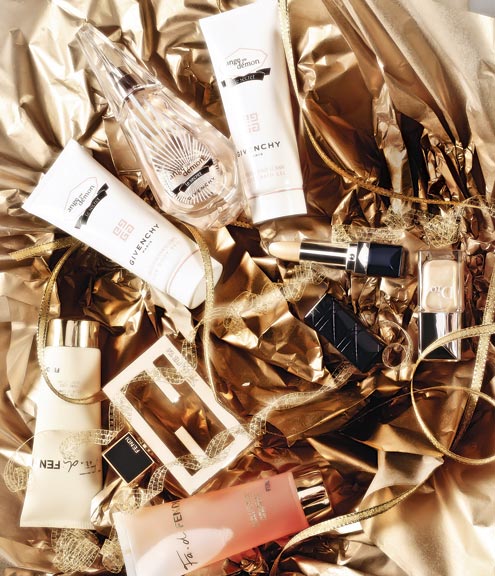 Perfume Fan de Fendi, que viene acompañado de un gel de ducha y leche perfumada ($410). Ange ou Démon, Le Secret, perfume. Llega con gel de ducha y voile corporal ($415, Givenchy). Rouge Dior les Rouge, labial número 217, ($175 Dior). Dior Vernis, esmalte color 221 ($119, Dior).